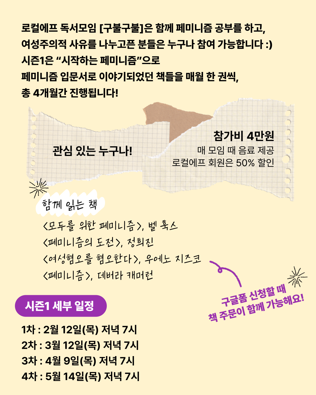 로컬에프 페미니즘 책모임 [구불구불] 시즌1. “시작하는 페미니즘”에서 함께 페미니즘 공부를 하고, 여성주의적 사유를 나누고픈 분들을 모집합니다! 시즌1은 페미니즘 입문서로 이야기되었던 책들을 매월 한 권씩 총 4개월 동안 이어갑니다.