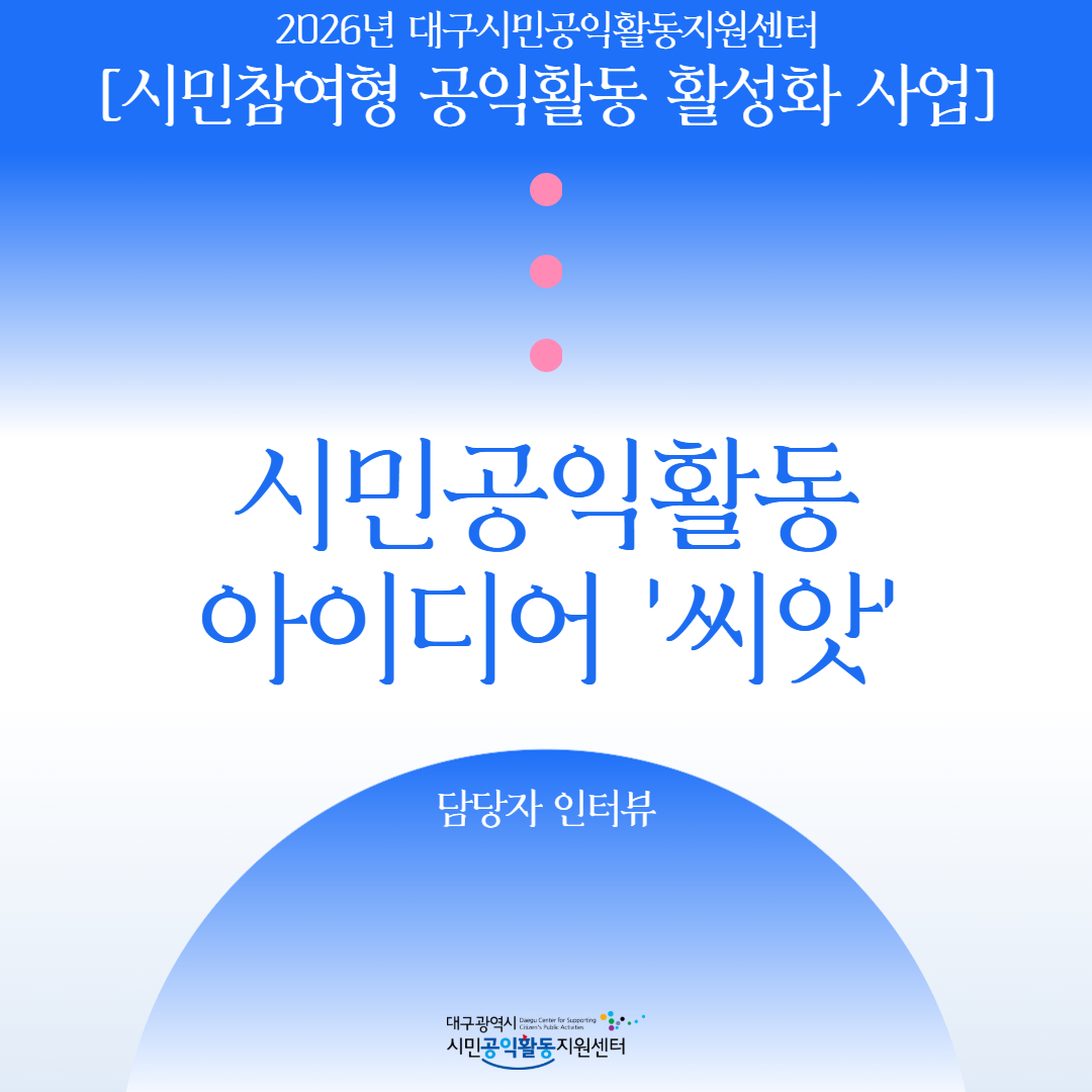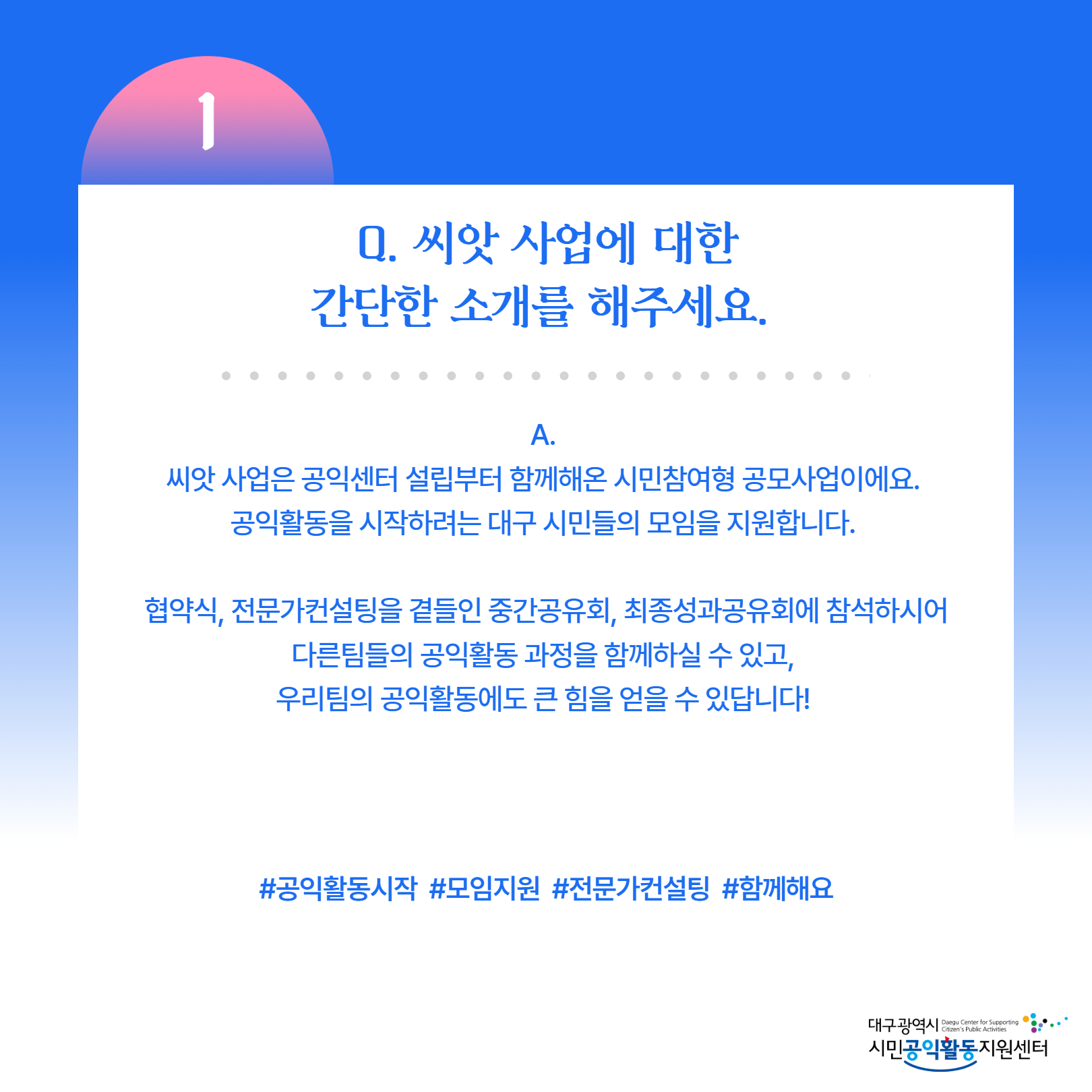 씨앗 사업은 공익센터 설립부터 함께해온 시민참여형 공모사업이에요. 공익활동을 시작하려는 대구 시민들의 모임을 지원합니다. 협약식, 전문가컨설팅을 곁들인 중간공유회, 최종성과공유회에 참석하시어 다른팀들의 공익활동 과정을 함께하실 수 있고, 우리팀의 공익활동에도 큰 힘을 얻을 수 있답니다!