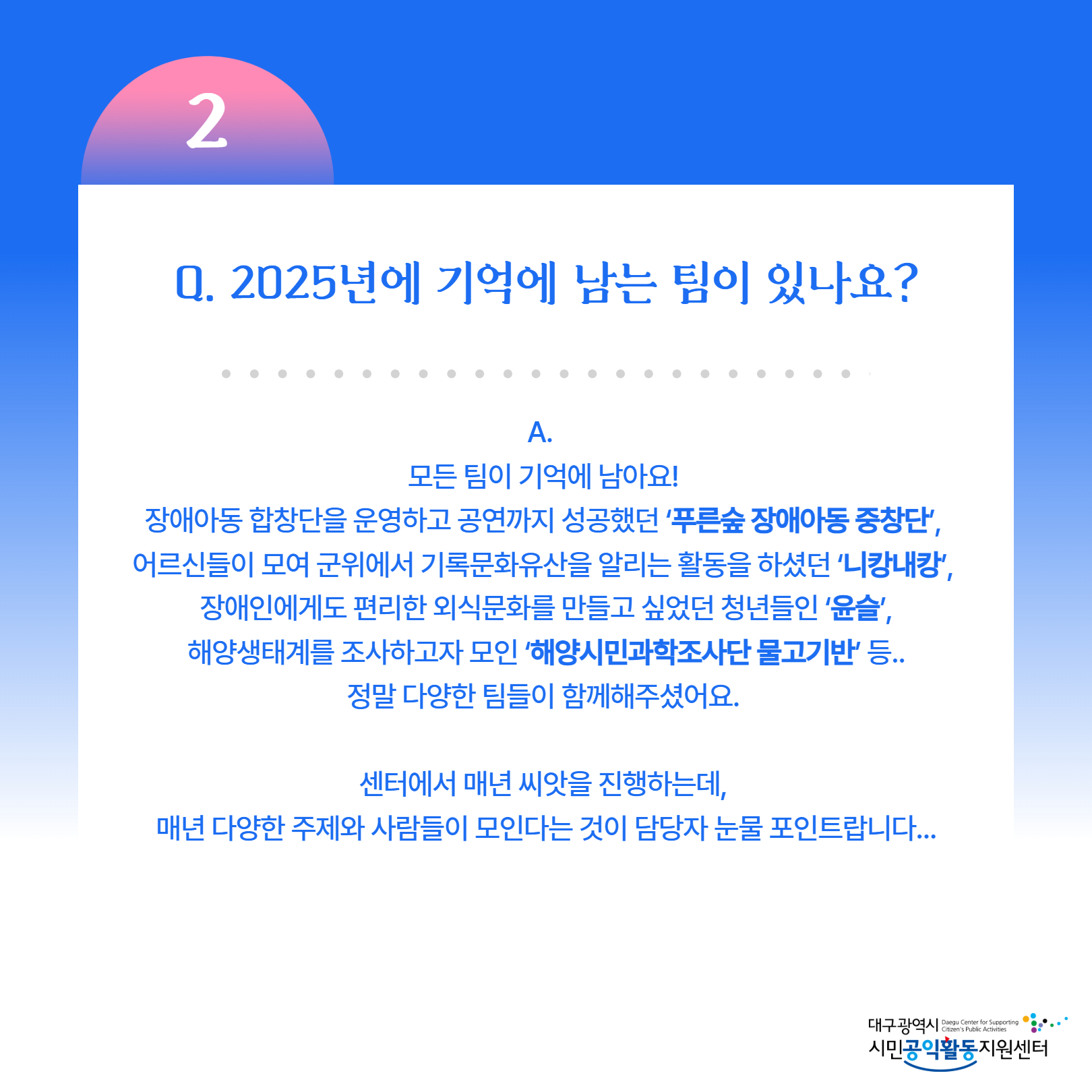 모든 팀이 기억에 남아요! 장애아동 합창단을 운영하고 공연까지 성공했던 ‘푸른숲 장애아동 중창단’, 어르신들이 모여 군위에서 기록문화유산을 알리는 활동을 하셨던 ‘니캉내캉’, 장애인에게도 편리한 외식문화를 만들고 싶었던 청년들인 ‘윤슬’, 해양생태계를 조사하고자 모인 ‘해양시민과학조사단 물고기반’ 등.. 정말 다양한 팀들이 함께해주셨어요. 센터에서 매년 씨앗을 진행하는데, 매년 다양한 주제와 사람들이 모인다는 것이 담당자 눈물 포인트랍니다...