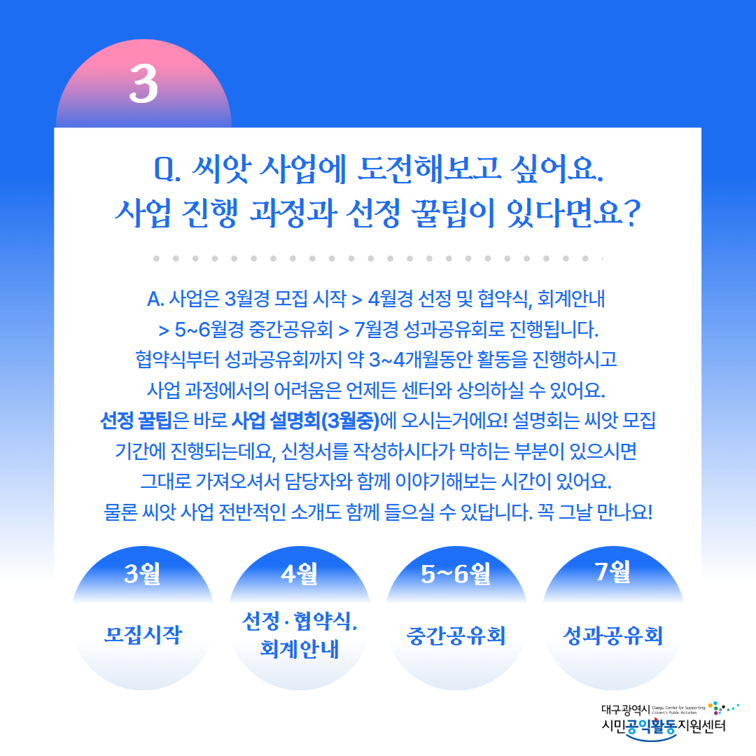 3. 씨앗 사업에 도전해보고 싶어요. 사업 진행 과정과 선정 꿀팁이 있다면요?
