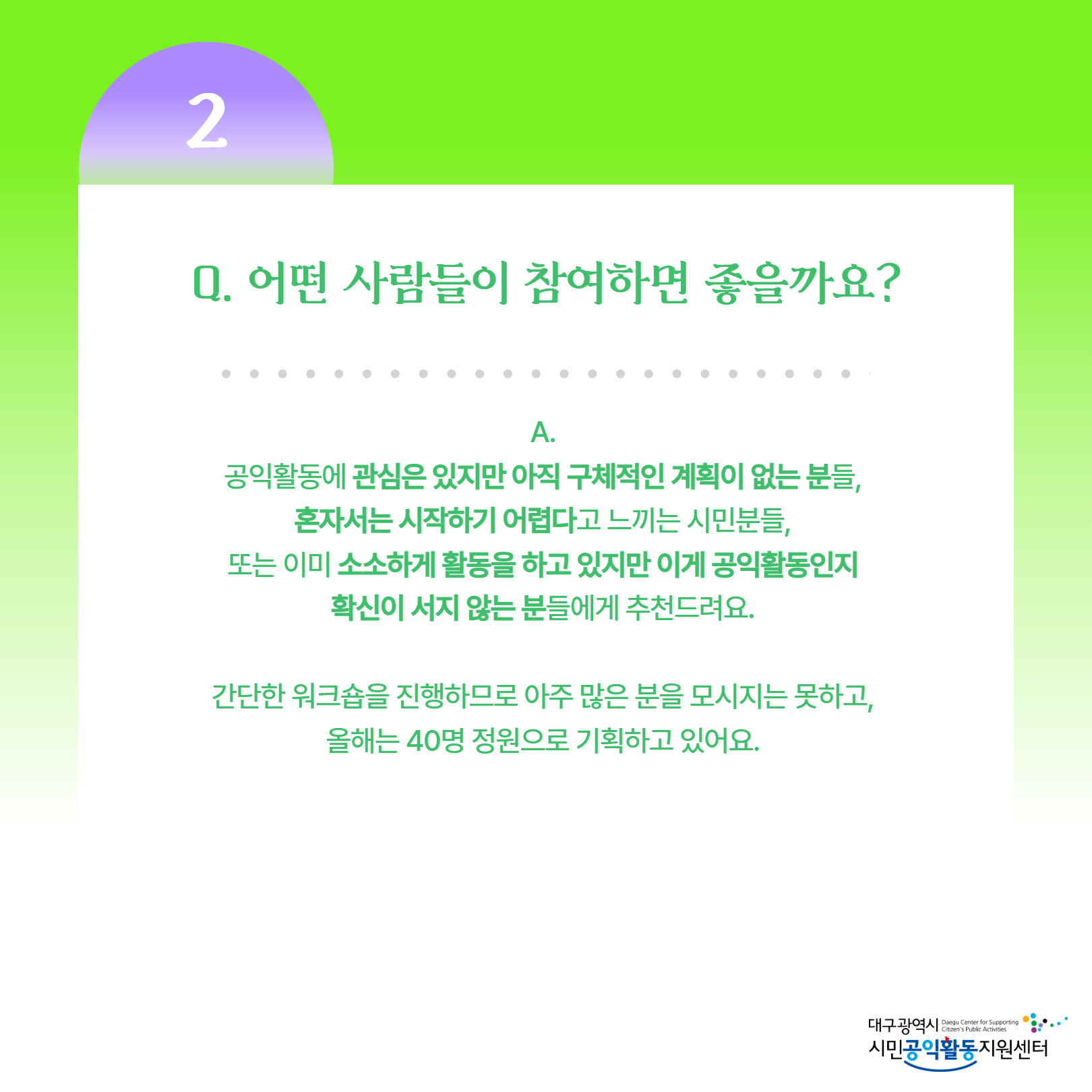 공익활동에 관심은 있지만 아직 구체적인 계획이 없는 분들, 혼자서는 시작하기 어렵다고 느끼는 시민분들, 또는 이미 소소하게 활동을 하고 있지만 이게 공익활동인지 확신이 서지 않는 분들에게 추천드려요. 간단한 워크숍을 진행하므로 아주 많은 분을 모시지는 못하고, 올해는 40명 정원으로 기획하고 있어요.