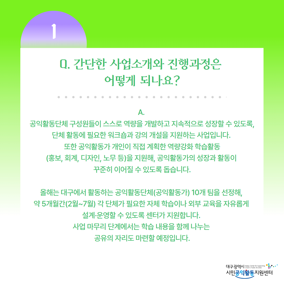 올해는 대구에서 활동하는 공익활동단체(공익활동가) 10개 팀을 선정해, 약 5개월간(2월~7월) 각 단체가 필요한 자체 학습이나 외부 교육을 자유롭게 설계·운영할 수 있도록 센터가 지원합니다. 사업 마무리 단계에서는 학습 내용을 함께 나누는 공유의 자리도 마련할 예정입니다.