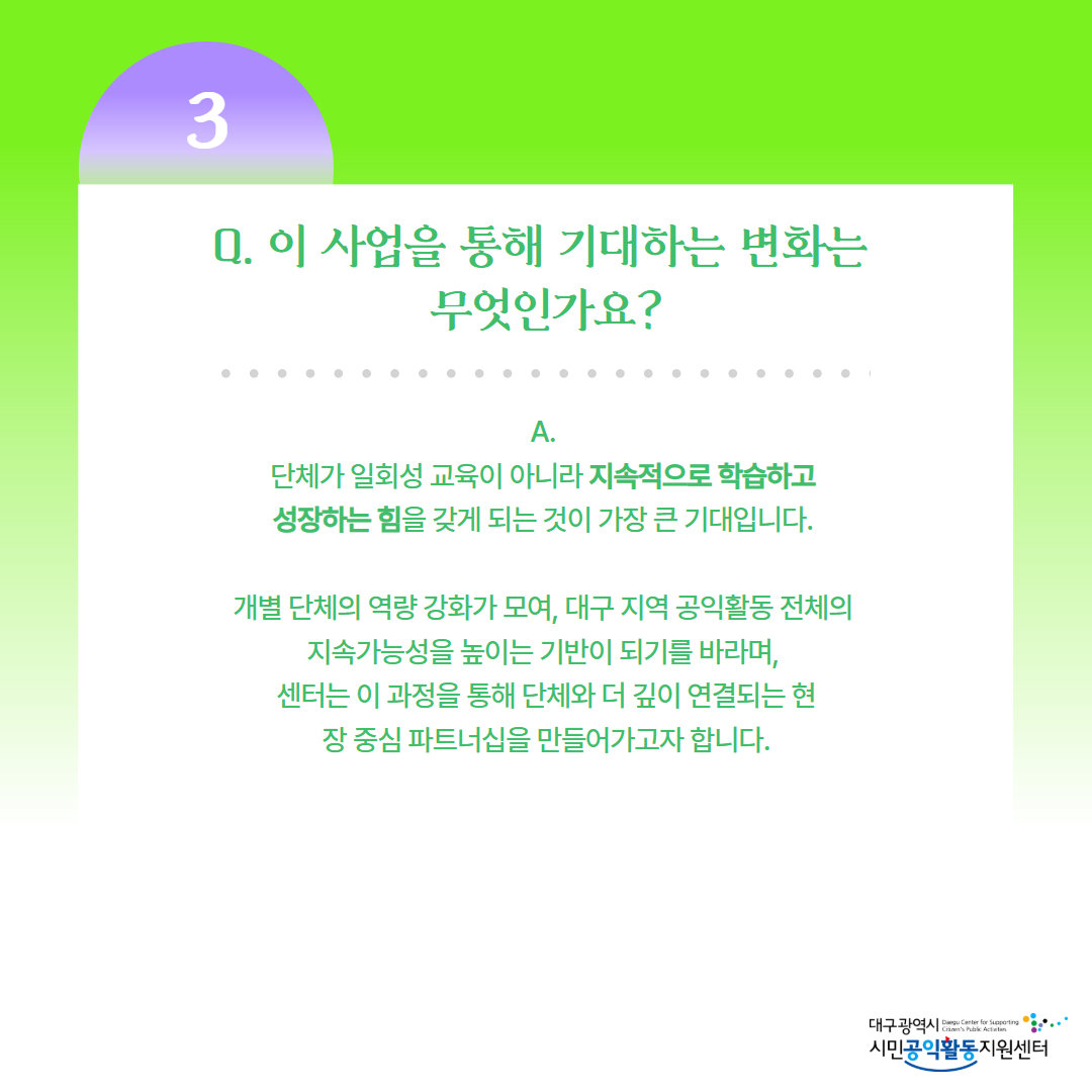 단체가 일회성 교육이 아니라 지속적으로 학습하고 성장하는 힘을 갖게 되는 것이 가장 큰 기대입니다. 개별 단체의 역량 강화가 모여, 대구 지역 공익활동 전체의 지속가능성을 높이는 기반이 되기를 바라며, 센터는 이 과정을 통해 단체와 더 깊이 연결되는 현장 중심 파트너십을 만들어가고자 합니다.
