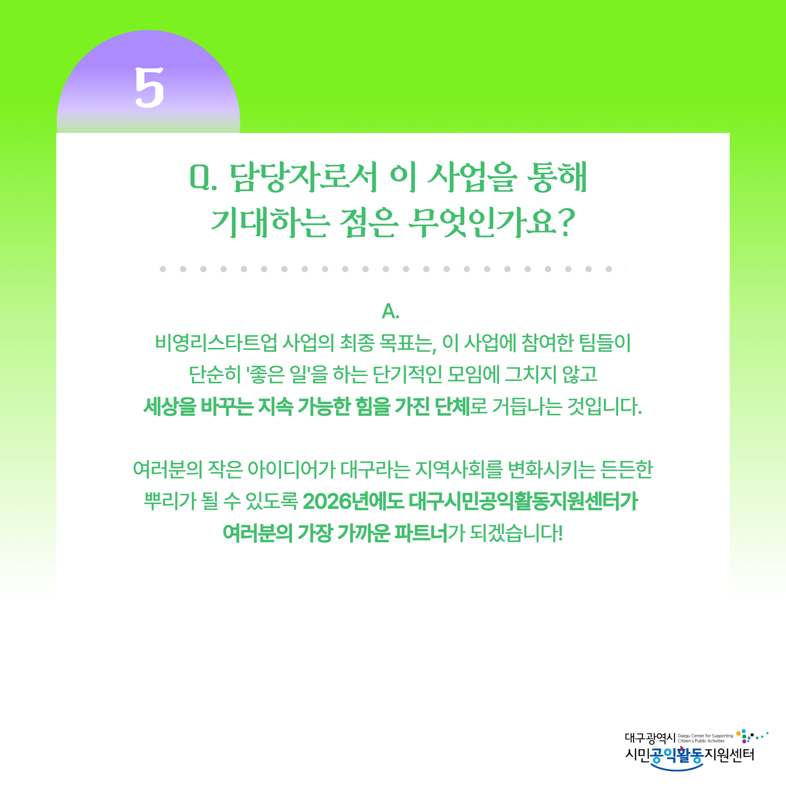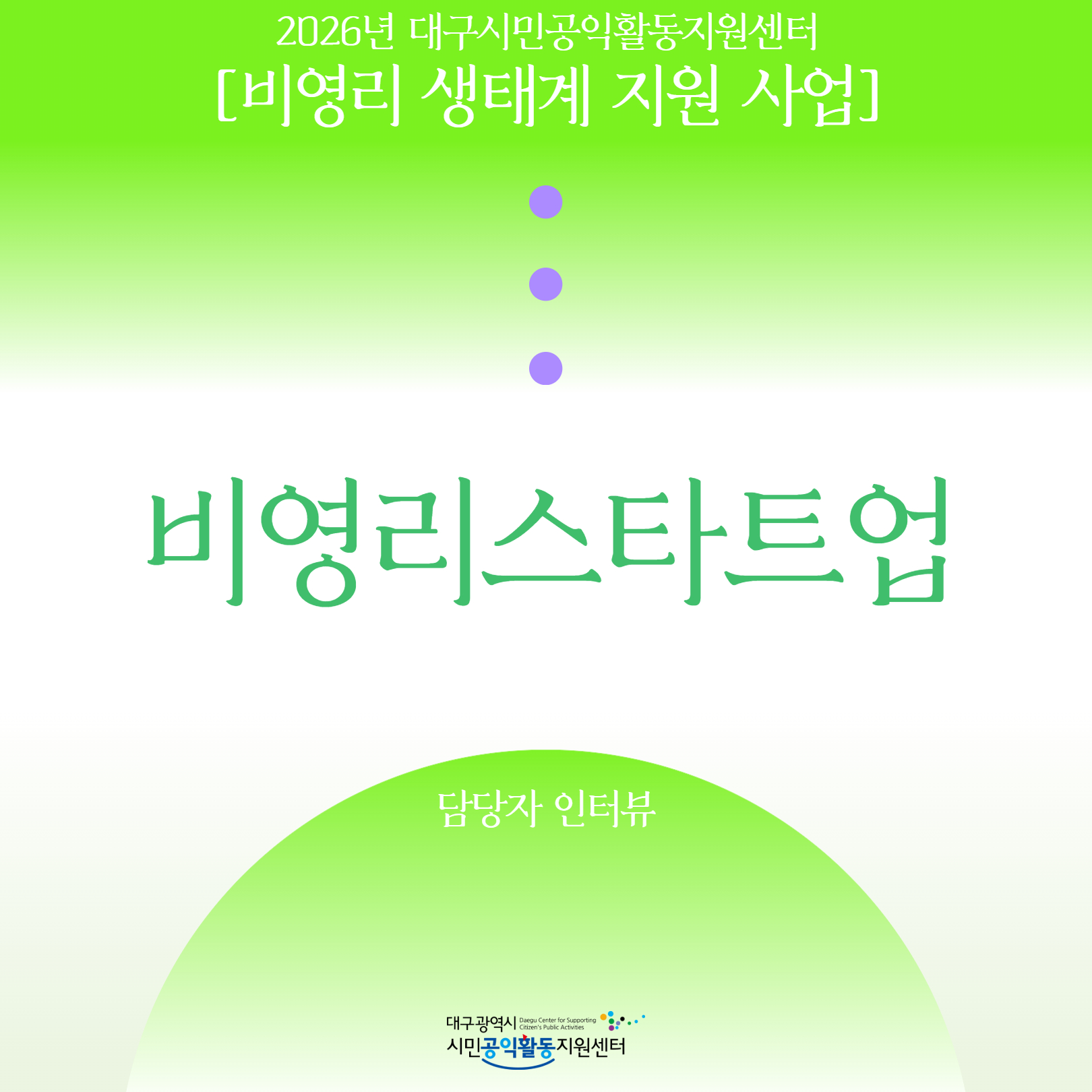 -비영리 스타트업 사업의 최종 목표는, 이 사업에 참여한 팀들이 단순히 ‘좋은 일’을 하는 단기적인 모임에 그치지 않고 세상을 바꾸는 지속 가능한 힘을 가진 단체로 거듭나는 것입니다. 여러분의 작은 아이디어가 대구라는 지역사회를 변화시키는 든든한 뿌리가 될 수 있도록 2026년에도 대구시민공익활동지원센터가 여러분의 가장 가까운 파트너가 되겠습니다.