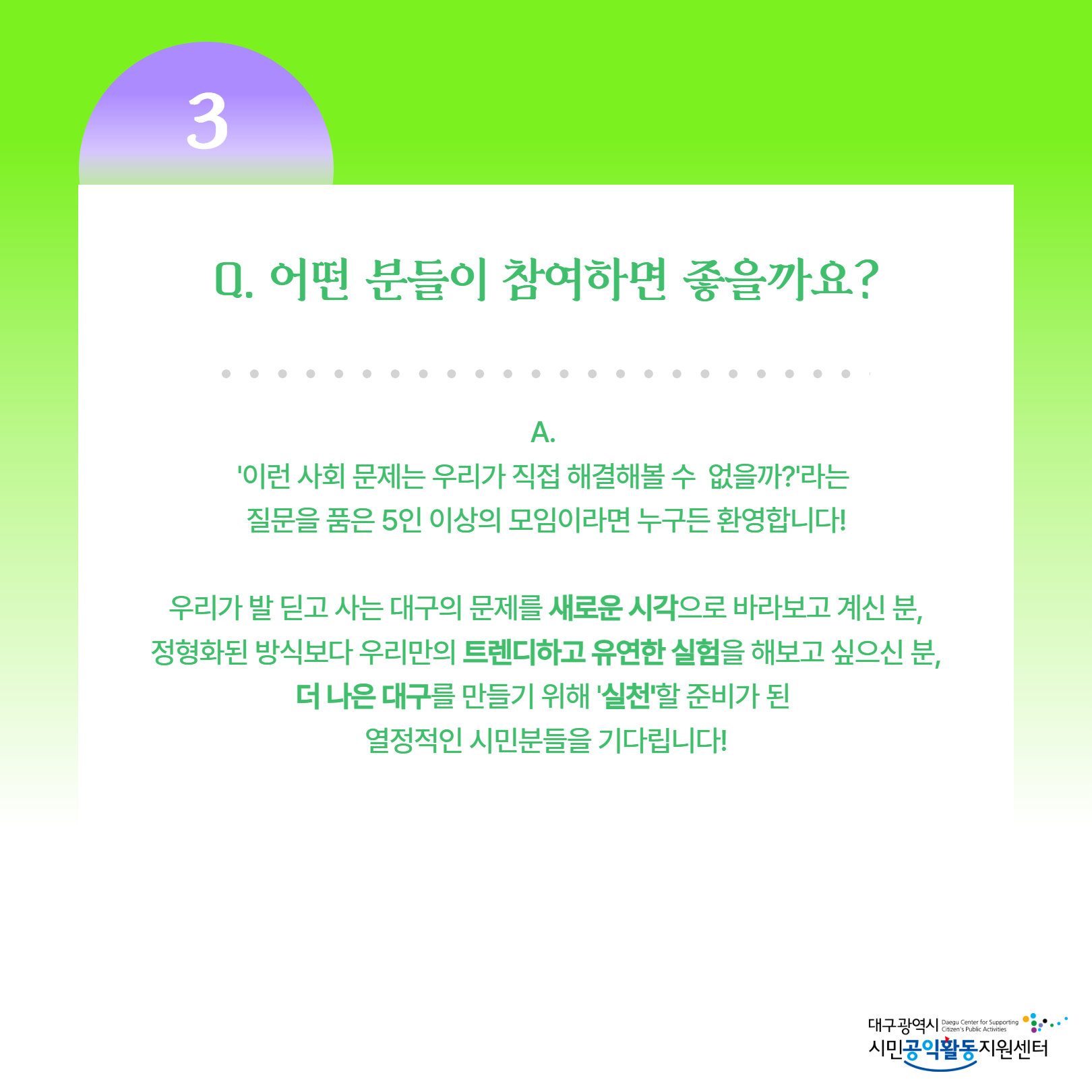 ‘이런 사회 문제는 우리가 직접 해결해볼 수 없을까?’ 라는 질문을 품은 5인 이상의 모임이라면 누구든 환영합니다! 우리가 발 딛고 사는 대구의 문제를 새로운 시각으로 바라보고 계신 분, 정형화된 방식보다 우리만의 트렌디하고 유연한 실험을 해보고 싶은 분, 더 나은 대구를 만들기 위해 ‘실천’할 준비가 된 열정적인 시민분들을 기다립니다.