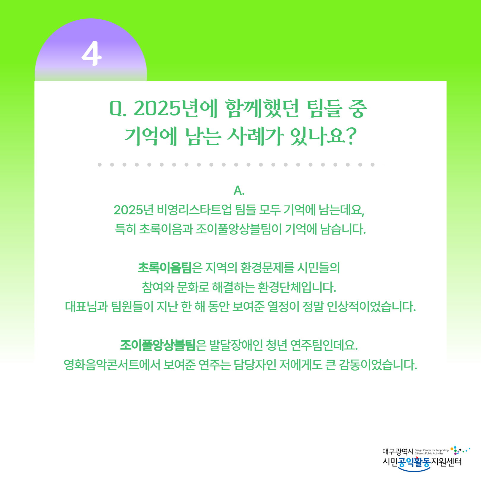 2025년 비영리스타트업 팀들 모두 기억에 남는데요. 특히 초록이음과 조이풀앙상블팀이 기억에 남습니다. 초록이음팀은 지역의 환경문제를 시민들의 참여와 문화로 해결하는 환경단체입니다. 대표님과 팀원들이 지난 한 해 동안 보여준 열정이 정말 인상적이었습니다. 조이풀앙상블팀은 발달장애인 청년 연주팀인데요. 영화음악콘서트에서 보여준 연주는 담당자인 저에게도 큰 감동이었습니다.