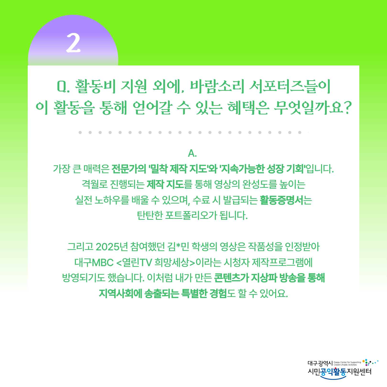 가장 큰 매력은 전문가의 ‘밀착 제작 지도’와 ‘지속가능한 성장 기회’입니다. 격월로 진행되는 제작 지도를 통해 영상의 완성도를 높이는 실전 노하룰 배울 수 있으며, 수료 시 발급되는 활동증명서는 탄탄한 포트폴리오가 됩니다. 그리고 2025년 참여했던 김*민 학생의 영상은 작품성을 인정받아 대구MBC <열린TV 희망세상>이라는 시청자 제작프로그램에 방영되기도 했습니다. 이처럼 내가 만든 콘텐츠가 지상파 방송을 통해 지역사회에 송출되는 특별한 경험도 할 수 있어요.