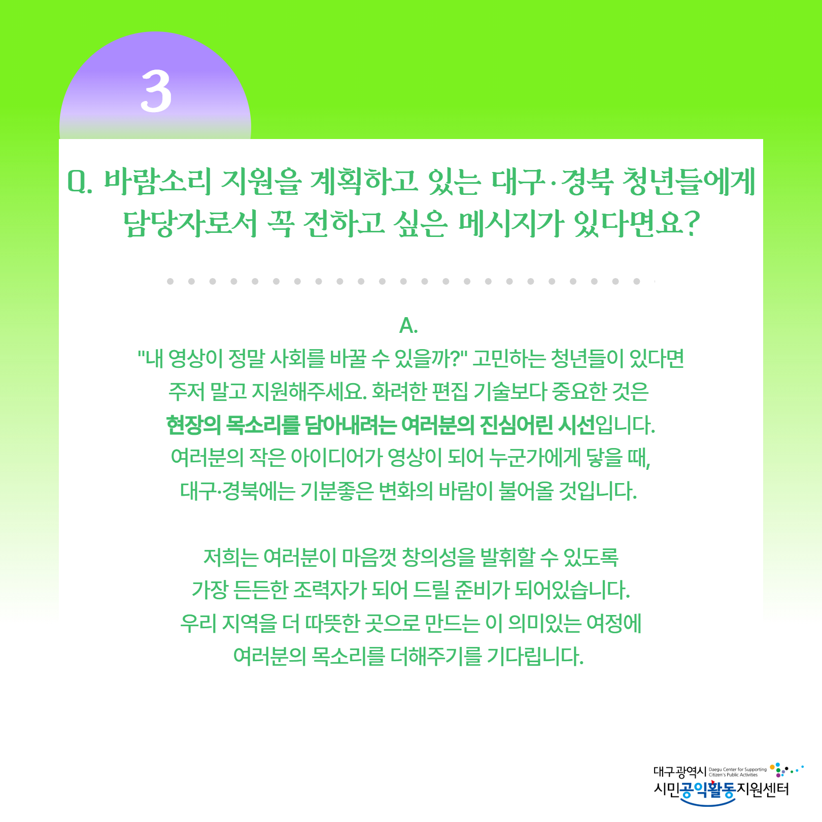 3. 바람소리 지원을 계획하고 있는 대구 경북 청년들에게 담당자로서 꼭 전하고 싶은 메시지가 있다면요?