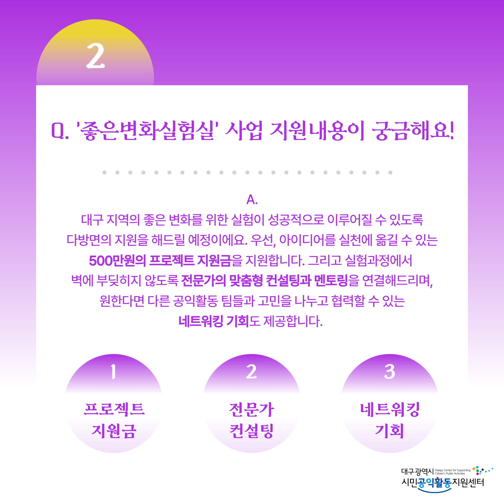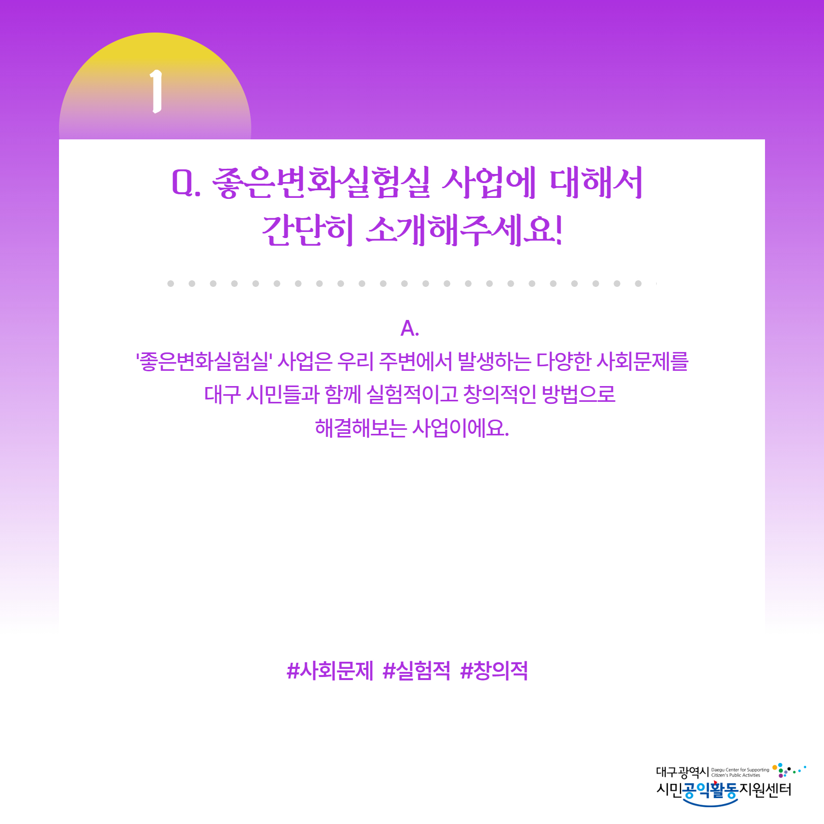 -'좋은변화실험실' 사업은 우리 주변에서 발생하는 다양한 사회문제를 대구시민들과 함께 실험적이고 창의적인 방법으로 해결해보는 사업이에요!