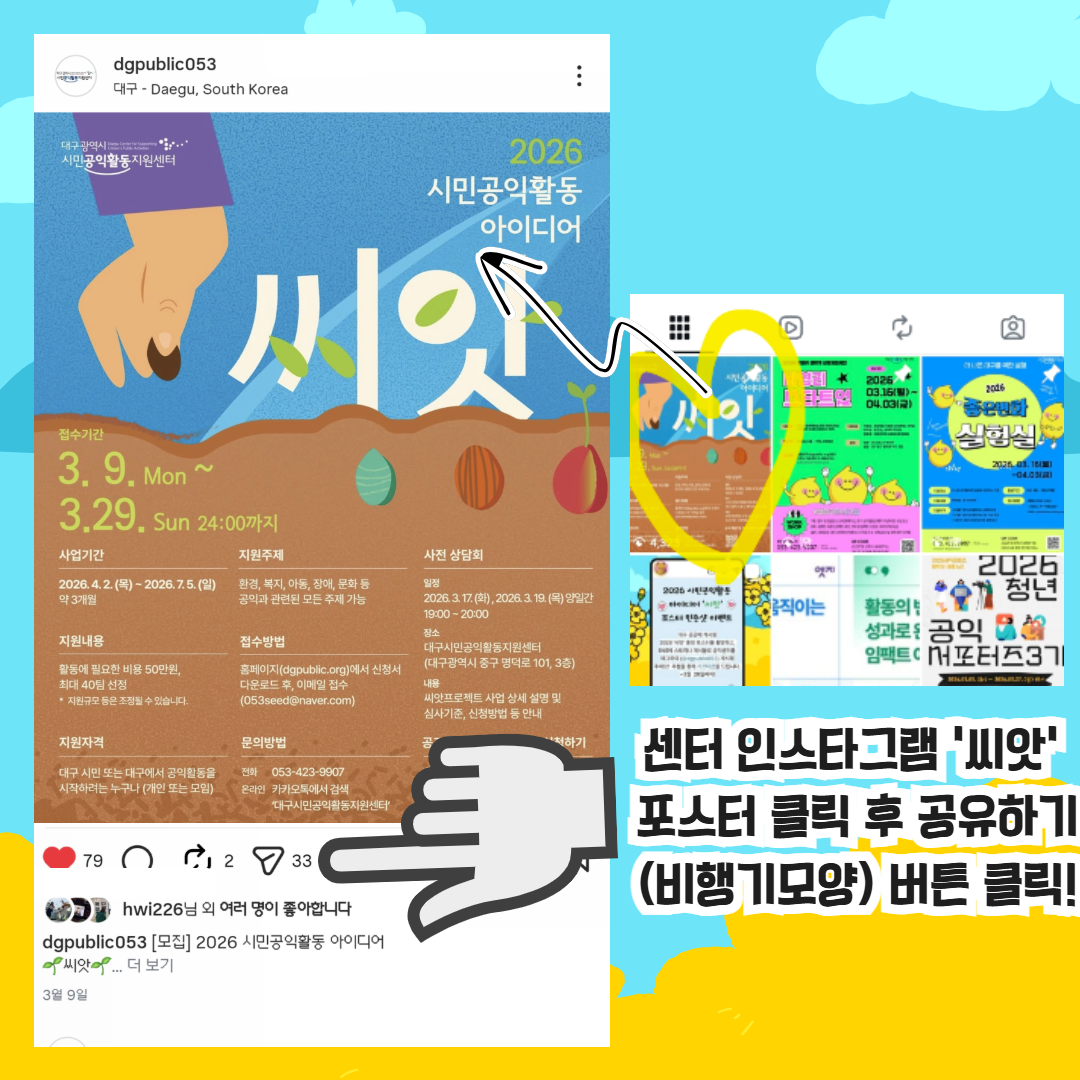 1️⃣ 센터 상단 고정된 '씨앗' 포스터를 인스타그램 스토리나 게시물로 @dgpublic053 태그 후