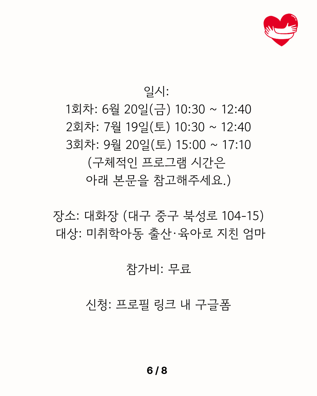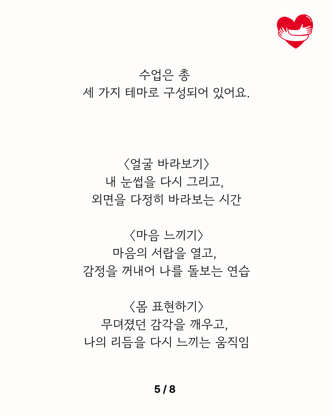 ▫️날짜 : 6월 20일 금요일 ▫️시간 : 10:30-11:30(얼굴/마음수업 택1) + 11:40-12:40(몸 수업) ▫️장소 : 대화장 (대구 중구 북성로 104-15) (🅿️경상감영공원주차장, 신동영주차장, 향촌주차장을 이용) ▫️인원 : 최대 12인 ▫️참가비 : 무료 ▫️신청방법 : https://forms.gle/AaUnVh7jBTgd3KiJ6 ‘대구시민공익활동지원센터’ 비영리스타트업 사업으로 진행됩니다. (수업 중 사진 및 영상촬영이 있습니다)