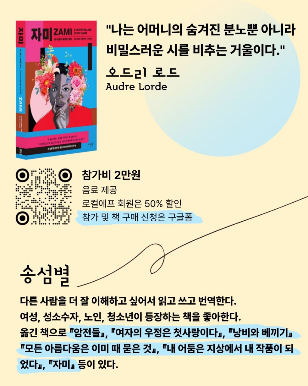 <자미>를 한국어로 번역한 송섬별 번역가와 함께 <자미>에 담긴 이야기와, 번역의 현장에서 마주한 선택들, 그리고 퀴어 페미니즘 언어를 한국어로 옮긴다는 것의 의미를 나누어요.