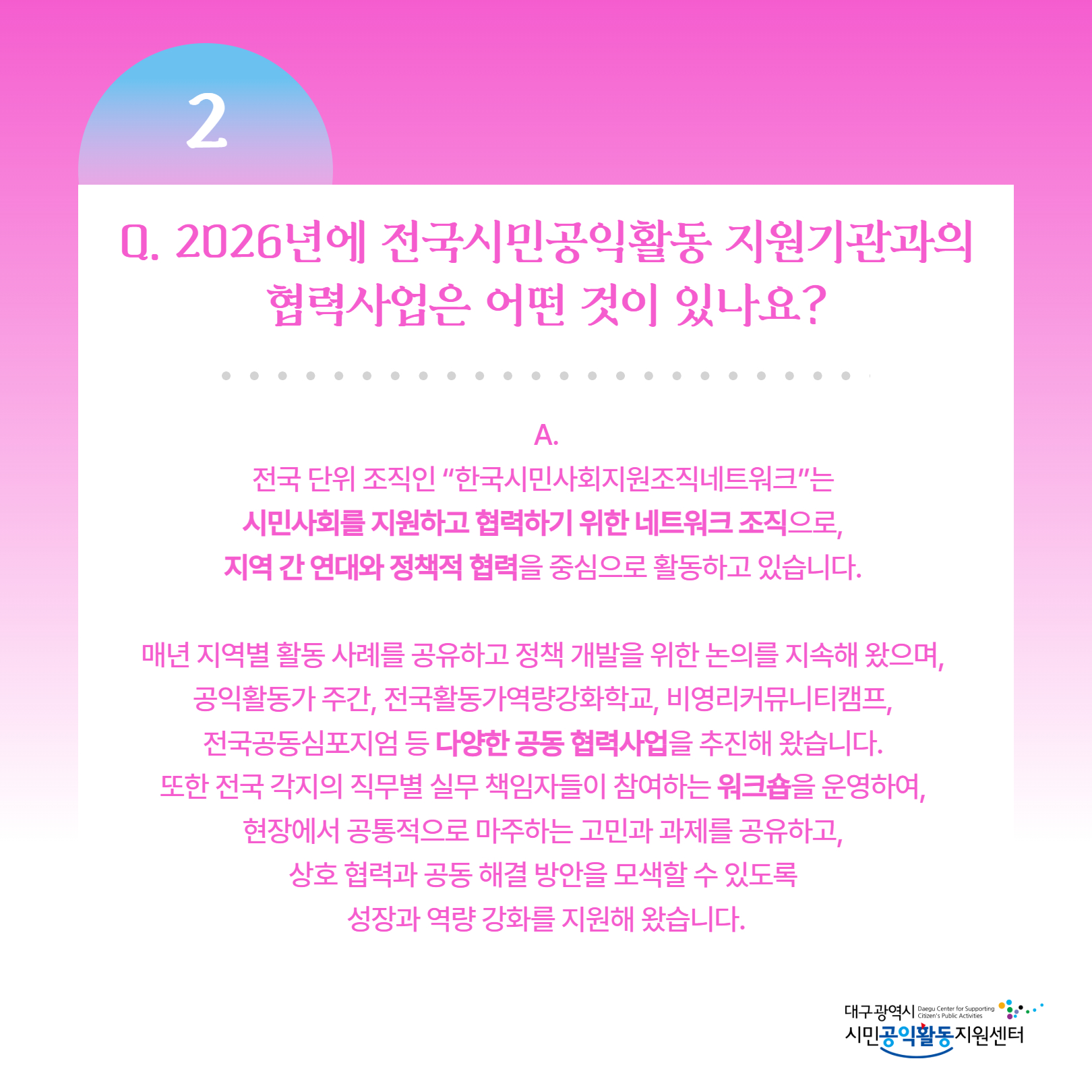 2. 2026년에 전국시민공익활동 지원기관과의 협력사업은 어떤 것이 있나요?