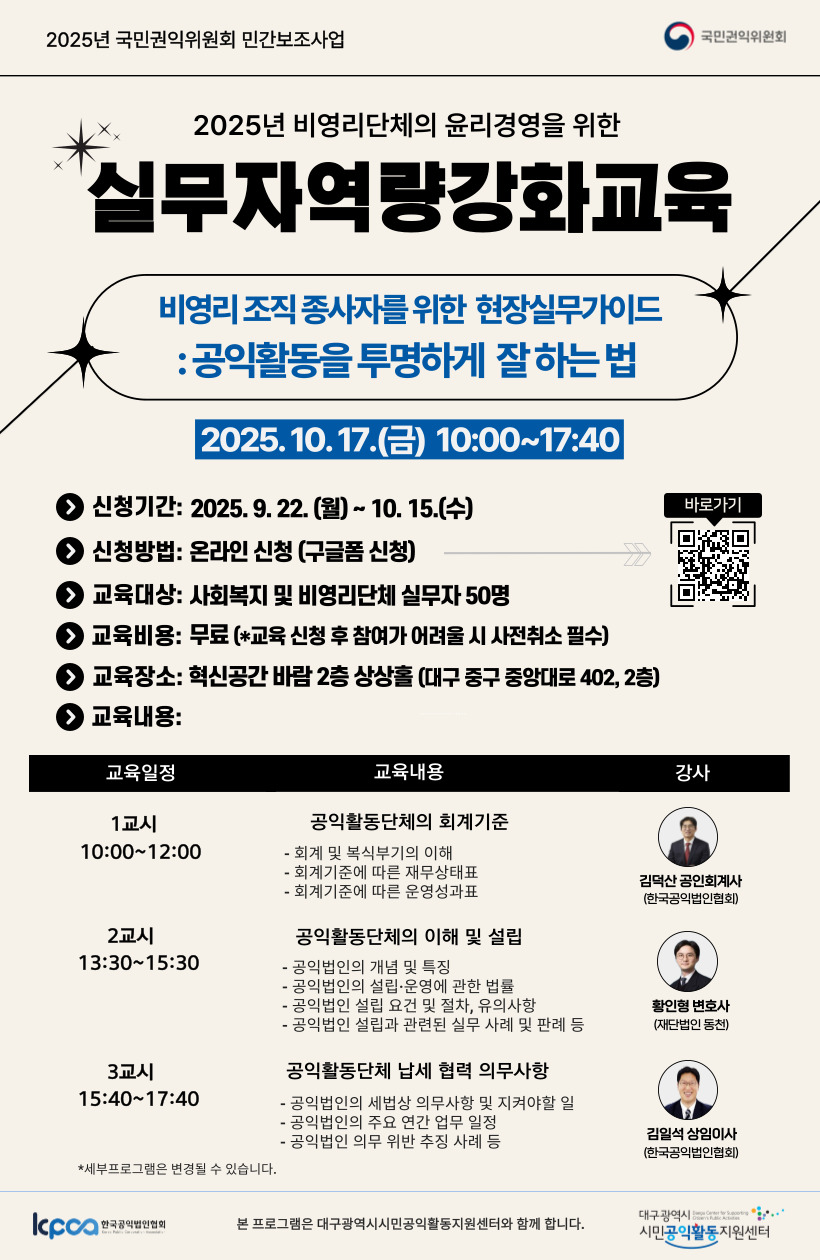 문의 : 대구시민공익활동지원센터 카카오톡 채널추가 후 채팅상담 또는 053-423-9907